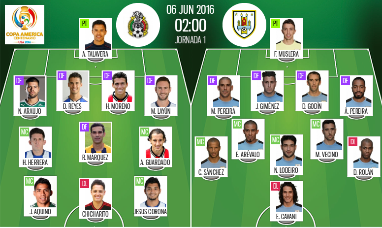 México se lleva la victoria ante la selección de Uruguay y suma los 3 primeros puntos para liderar el grupo C tras la victoria de Venezuela 1-0 ante Jamaica, esta fue la alineación que sacaron los dos equipos con la ausencia de Luis Suarez por la lesión que sufrió en la copa del rey.