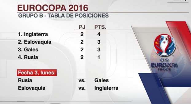 El próximo partido de Inglaterra será el 20 de Junio a las 21:00 frente a Eslovaquia donde las dos selecciones se jugarán el pase a siguiente ronda, mientras que Gales se enfrentará a Rusia que ya está eliminada el 20 de Junio a las 21:00 donde los de Gales se juegan el pase a siguiente ronda.