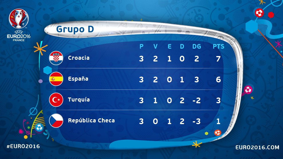 | Croacia se clasifica primera de grupo Ivan Perisic fue elegido mejor jugadr del partido gracias en parte a la asistencia del primer gol y al gol que le daba a a los croatas la victoria. ![]() Con todos los partidos ya disputados en el grupo D, el grupo queda de la siguiente manera: ![]() España ya conoce su rival en octavos de final que será Italia mientras que Croacia tendrá que esperar a como se desarrolla la última jornada de partidos de la fase de grupos. Estadísticas del partido Resumen del partido |